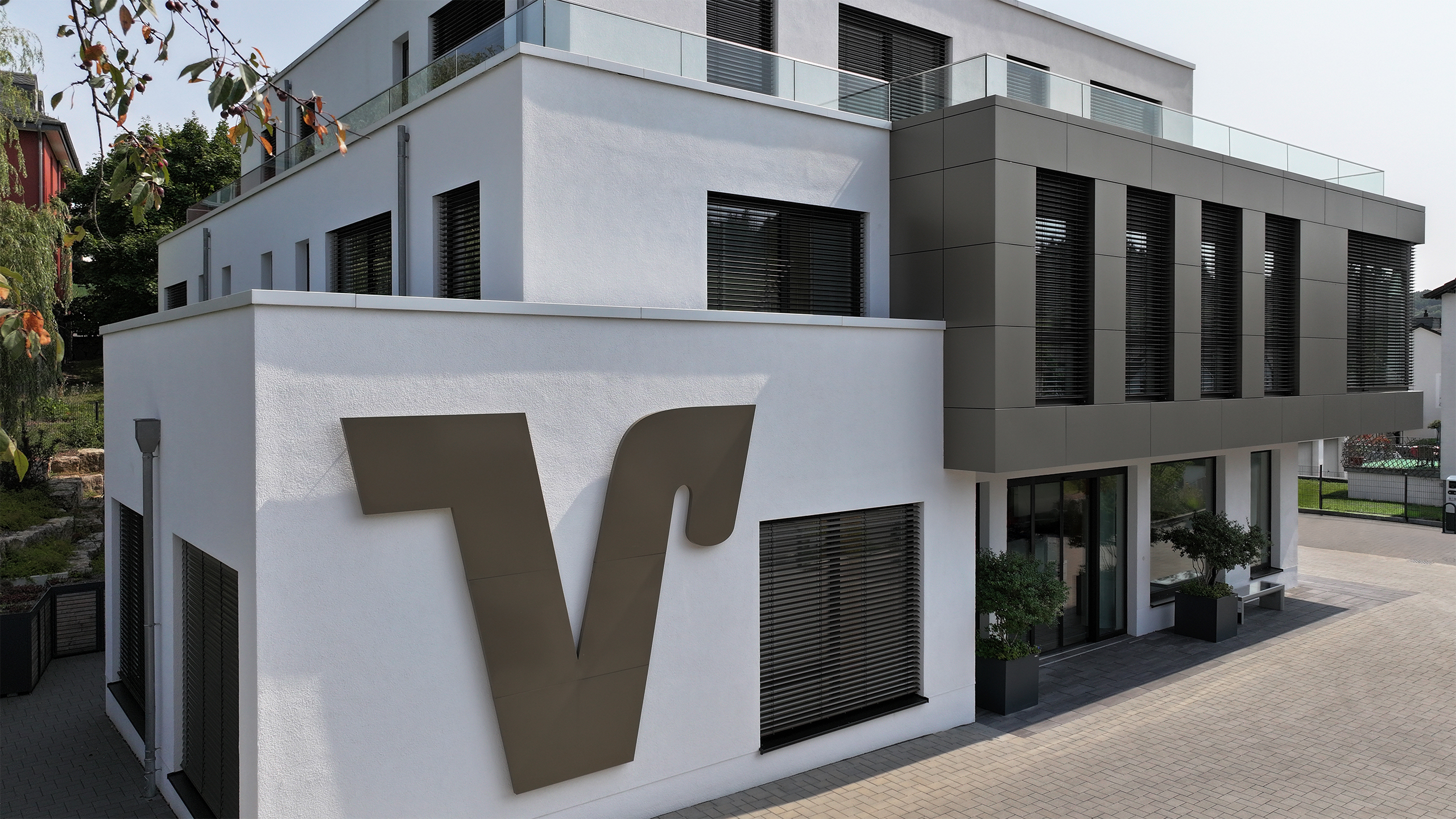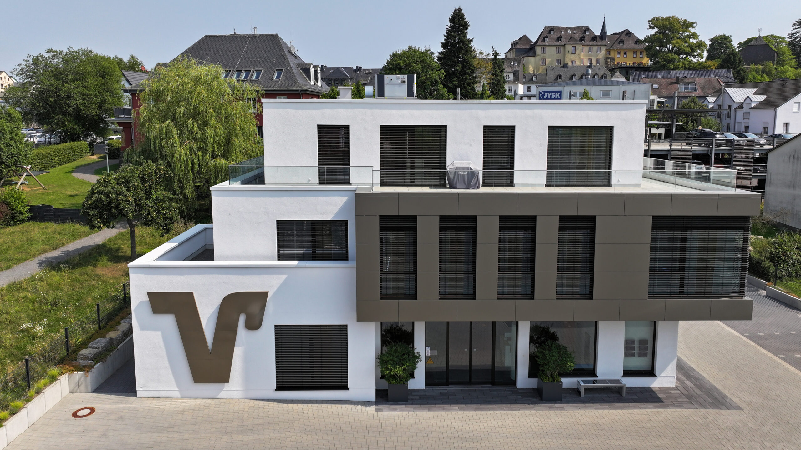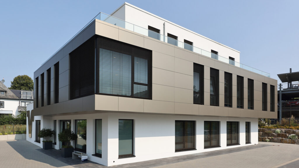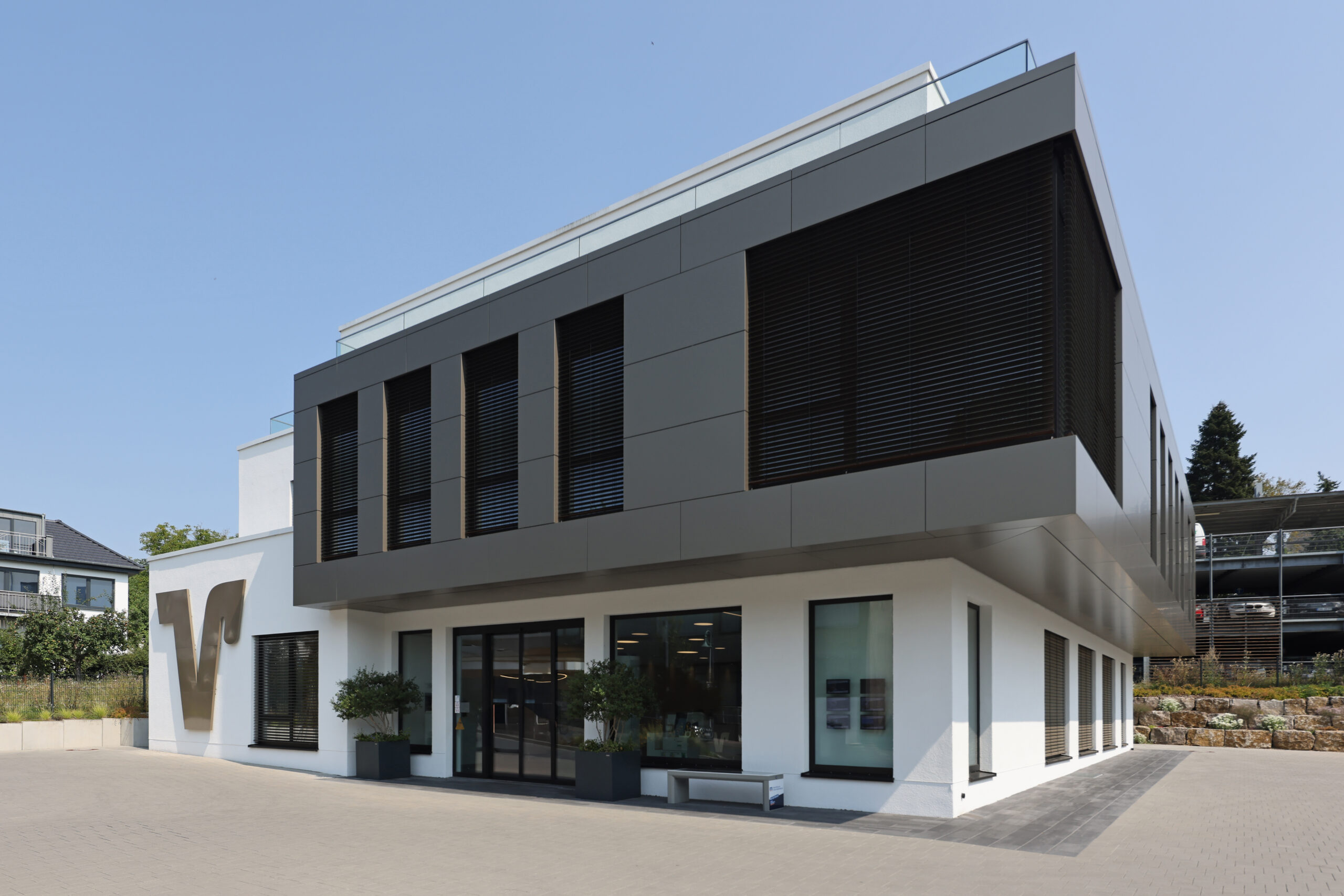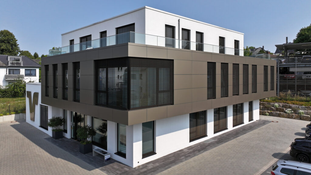 - Eleganter und repräsentativer Blickfang durch metallische Vorhangfassade im System Alucobond mit kubischer Ausformung und großzügigen Glasflächen